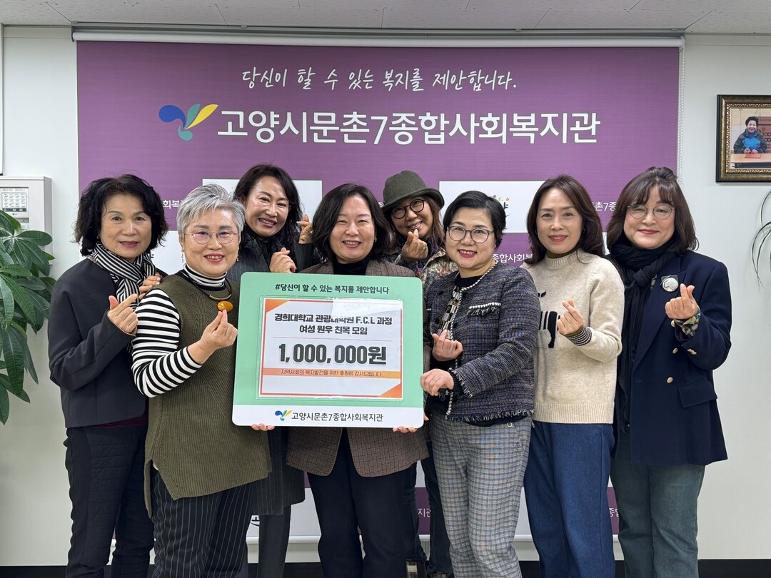[부자동네타임즈 = 김인수 기자] 경희대학교 관광대학원 퍼스트클래스리더(FCL) 과정 여성 원우 친목모임이 지난 30일 고양시문촌7종합사회복지관을 방문해 저소득 취약계층 지원을 위한 후원금 100만 원을 전달했다.