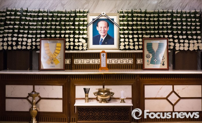 (서울=포커스뉴스) 14일 오후 서울 서대문구 신촌세브란스병원 장례식장에 마련된 故 이만섭 국회의장의 빈소에 고인의 영정이 놓여 있다.