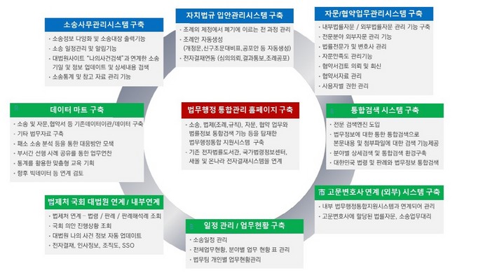 뿐만 아니라 사무 처리의 효율성을 높이기 위한 방안으로, 법제처.국회.대법원 사이트와 연계, 일정관리 및 업무현황, 시 고문변호사 연계 외부시스템, 통합검색시스템, 데이터 마트 구축을 통해 전문성을 강화했다.