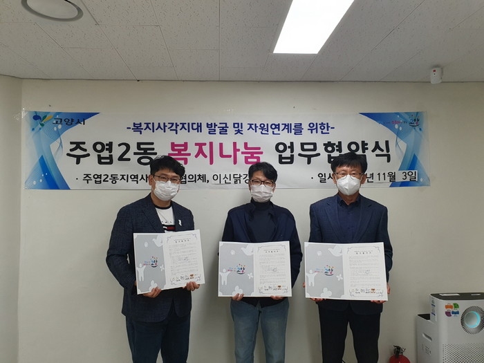 [부자동네타임즈 김인수기자] 일산서구 주엽2동 지역사회보장협의체는 지난 11월3일‘행복한가(家), 행복하닭’특화사업 일환으로 관내 식품업체‘이신닭강정 주엽점’과 저소득층 간식지원을 위한 업무협약을 체결했다.