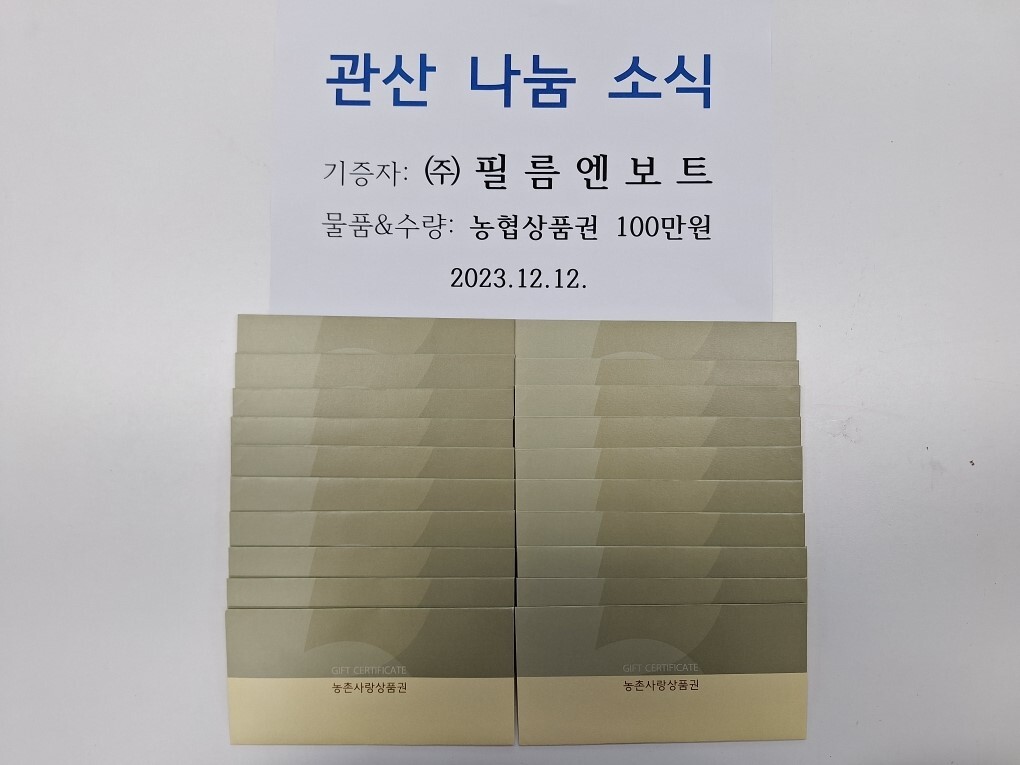 ㈜필름엔보트 김성희 대표는 “이웃들이 가장 편한 방법으로 가장 필요한 곳에 쓸 수 있는 상품권을 통해 따뜻한 연말연시를 보내기 바란다.”라고 전했다.