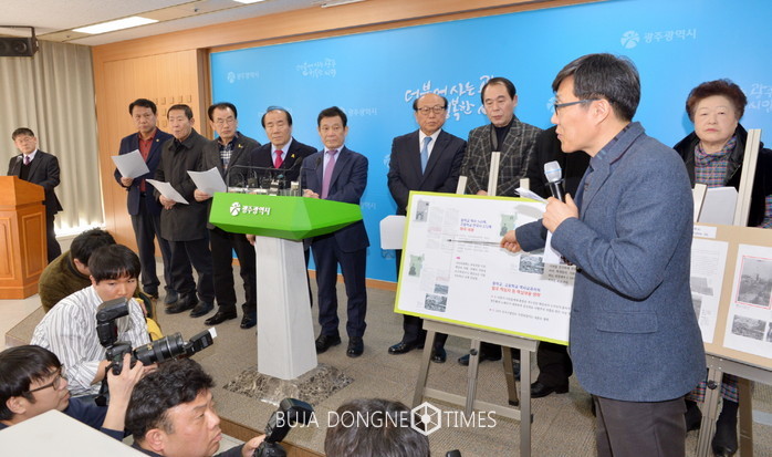 윤장현 광주광역시장, 장휘국 광주광역시죠육감 등 518역사왜곡대책위원들이 1일 오후 광주시정 5층 브리핑룸에서 국정역사교과서 철회를 요구하는 기자회견을 하였다.