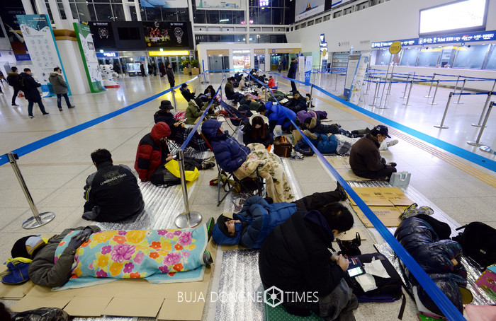 설 명절 승차표 예매가 시작된 10일 새벽 서울 중구 서울역 대합실에서 시민들이 밤을 새워가며 예매 개시를 기다리고 있다. 코레일은 올해 설 열차 승차권 예매를 오는 10일, 11일 양일 간 홈페이지와 지정된 역 창구, 승차권 판매 대리점 등을 통해 실시한다고 밝혔다. 10일에는 경부선, 경전선, 충북선, 동해선 승차권 예매가 진행되며, 11일에는 호남선, 전라선, 장항선, 중앙선 승차권 예매가 진행된다. 2017.01.10.