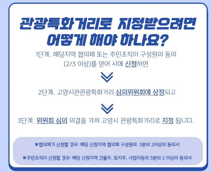 관광특화거리 지정을 희망하는 해당 지역 협의체 또는 주민조직은 구성원 3분의 2 이상의 동의를 얻어 신청할 수 있다. 신청서류는 고양시청 홈페이지 새소식을 참조하면 된다.
