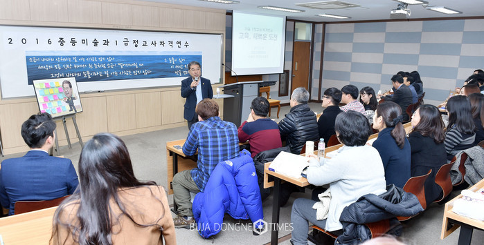 [부자동네타임즈 이영진 기자]이재정 경기도교육감은 9일 오후 안양시 경인교육대학교에서 열리고 있는 ‘2016 중등 미술과 1급 정교사 자격연수’에 참석해 연수 교사들을 격려하고 대화의 시간을 가졌다.