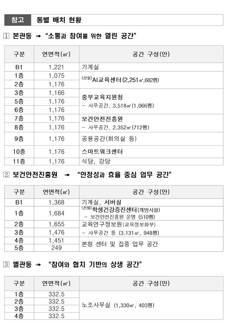 - 본관 3~6층에는 중부교육지원청, 7~8층에는 보건안전진흥원을 이전 배치하여 위반건축물 문제를 해소하고, 안정적이고 확장된 행정 공간을 확보한다.