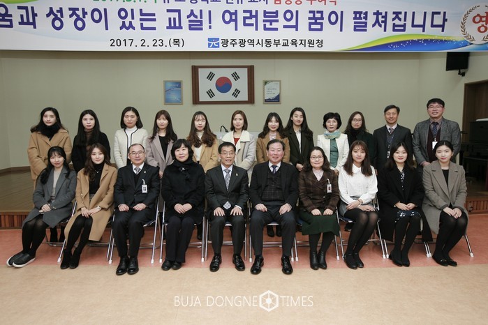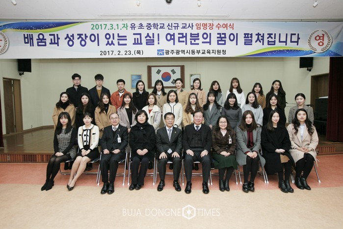광주광역시동부교육지원청(교육청 이종식)이 23일 동부교육지원청 대회의실에서 2017년 3월1일 자 신규 임용 유치원교사 3명, 초등학교교사 11명, 중하교교사 15명 등 총 29명을 대상으로 임명장 수요식을 개최했다.