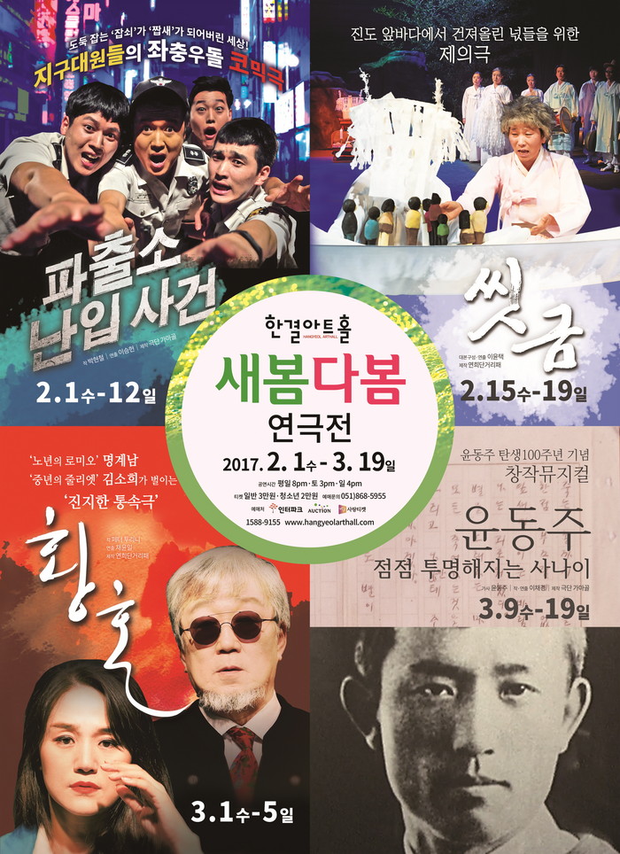 '파출소 난입사건'은 2월 1일(수)~12일(일)/ '씻금'은 2월 15일(수)~19일(일) / '황혼'은 3월 1일(수)~5일(일) / '뮤지컬 윤동주'는 3월 9일(목)~19일(일)에 각각 평일 오후 8시, 토요일 3시, 일요일 4시에 공연한다. 일반 3만원, 청소년 2만원 / 기타 자세한 사항은 한결아트홀 홈페이지 참고.
