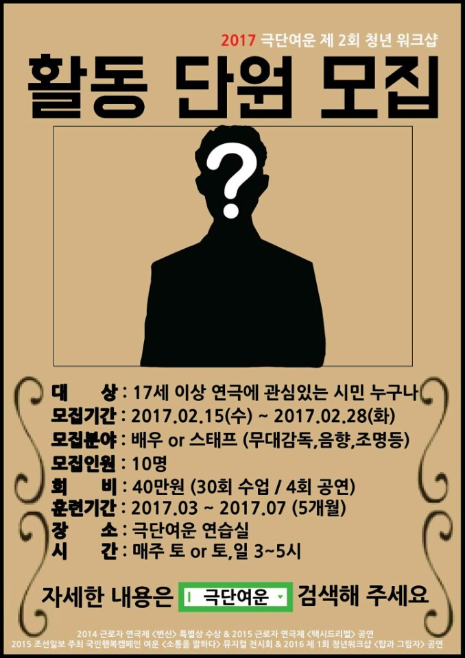 | △ 극단 여운, 2017 청년 워크샵 활동단원 모집 포스터 |