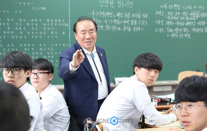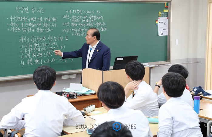 | △장휘국 교육감은 제57주년 4.19혁명 기념일을 하루 앞둔 18일 모교인 광주고등학교 2학년 4반 학생들을 대상으로 특별수업을 진행했다 |