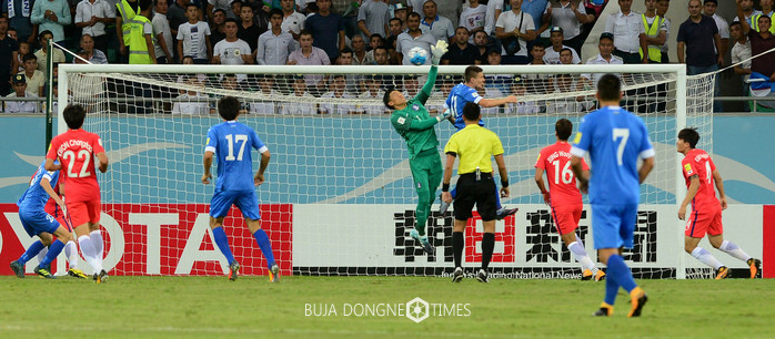 5일(현지시간) 오후 우즈베키스탄 타슈켄트 분요드코르 경기장에서 열린 '2018 러시아 월드컵 아시아 최종예선' 대한민국 대 우즈베키스탄의 경기, 골키퍼 김승규가 우즈벡 선수의 공격을 막고 있다. 2017.09.06.