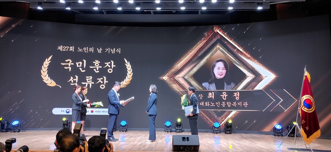 [부자동네타임즈 = 김인수 기자] 지난 25일 보건복지부가 주최하고 ㈔대한노인회가 주관하는‘제27회 노인의 날 기념식’에서 한국노인종합복지관협회의 추천으로 최윤정 고양시대화노인종합복지관장이 30년간 어르신 및 지역사회에 헌신한 공로를 인정받아 대한민국 국민훈장을 받았다.