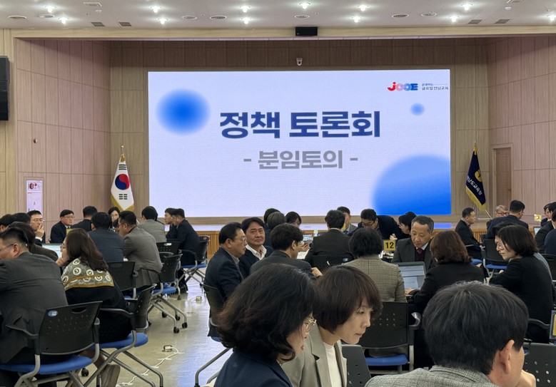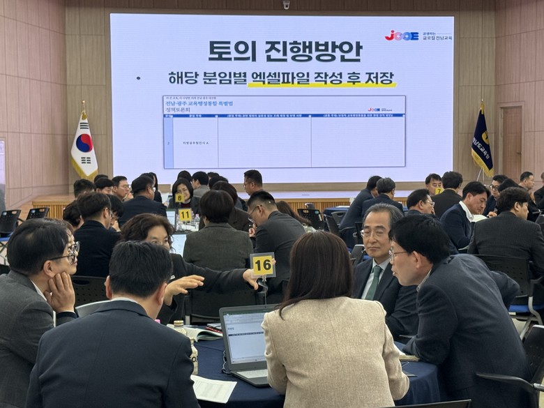 전남교육청은 16일 청사 대회의실에서 본청 팀장, 교육지원청 과장 등 중간관리자 142명이 참여한 정책토론회를 개최했다. 이번 토론회는 「전남·광주통합특별시 설치를 위한 특별법」 시행(2026. 7. 1.)에 앞서, 교육 분야 핵심 특례들을 지역 실정에 맞는 조례로 구체화하고, 통합 과정에서 예상되는 현장의 혼란을 최소화할 안정적 교육행정 통합 방안을 논의하는 자리로 마련됐다.