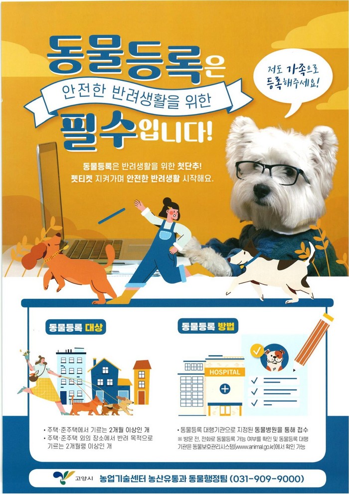 시 관계자는“고양시는 작년 경기도 내에서 가장 많은 동물을 등록한 대표적인 반려동물 친화 도시”라고 설명하며 “동물등록 미이행으로 인한 과태료 부과를 방지하고 책임감 있는 반려동물 문화의 정착을 위해 반려견 소유자께서는 꼭 동물 등록을 하시기 바란다”고 전했다.
