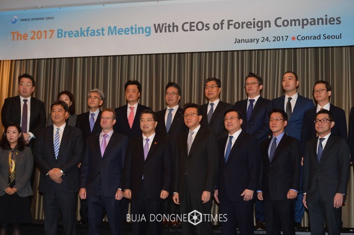진웅섭(앞줄 왼쪽 네번째) 금융감독원장이 24일 오전 서울 여의도 콘래드호텔에서 열린 외국계 금융회사(금융투자회사) CEO 조찬간담회 시작전 참석자들과 기념촬영을 하고 있다. 이번 간담회에 참석자들은 재산상 이익 제공 관련 규제완화, 외국계 금융회사에 대한 최다 출자자 적격성 심사 완화 등과 애로 및 건의사항을 청취하고 올해 대내외 주요 리스크 요인 및 전망에 대해 토론했다. 2017.01.24.