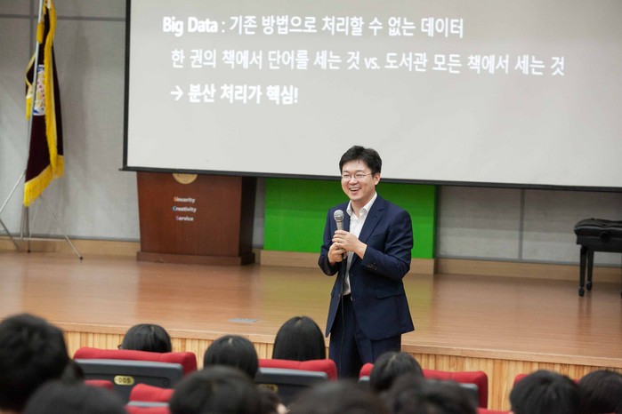 23일 열린 강연에는 SK텔레콤 최용진 Data Labs장이 강연자로 나서 '5G시대 Data/AI기술이 만드는 세상’을 주제로 ▲딥러닝 기술 기반 AI의 발전 ▲머신비전, 메타트론 기술 등 빅데이터를 이용한 기술개발의 실제 사례 등을 설명해 높은 호응을 받았다.