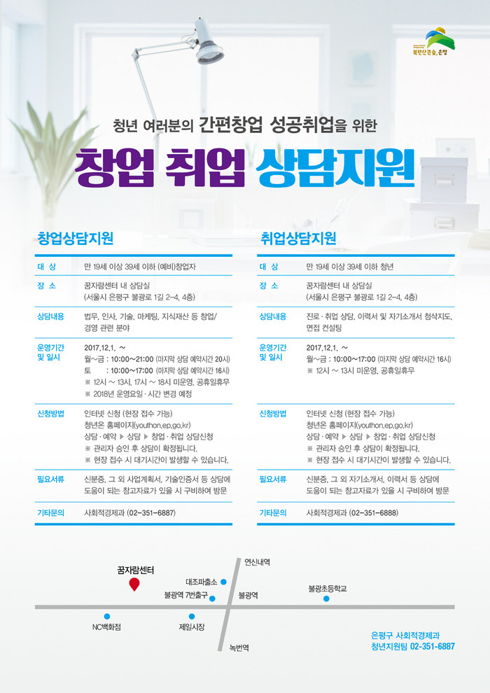 [부자동네타임즈 이병도 기자]은평구(구청장 김우영)는 청년들의 간편 창업 성공취업을 지원하기 위해 12월 1일부터 창업, 취업 상담 프로그램을 무료로 운영한다.