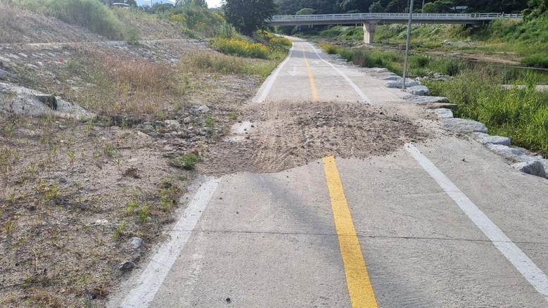 실제로 현장을 확인한 결과 도로 옆 사면은 빗물에 쓸려 자갈과 흙이 대거 유실됐고 자전거도로는 토사에 묻혀 정상적인 통행이 어려운 상태다. 도로 하부 지지층이 손상되며 도로 붕괴 가능성까지 우려되는 상황이지만, 안내 표지나 통제선조차 없는 상태다.