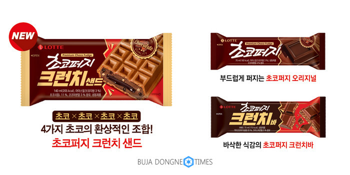 [부자동네타임즈 이병도 기자]롯데푸드㈜는 진한 초콜릿 퍼지시럽과 바삭한 크런치가 조화를 이루는 ‘초코퍼지 크런치샌드’를 선보인다고 7일 밝혔다. 지난 5월 출시한 초코퍼지 크런치바가 인기를 끌면서 이를 샌드로 만든 제품이다.