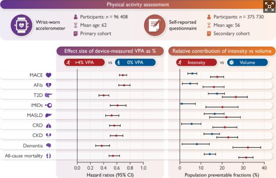 연구팀은 격렬한 신체활동(VPA)은 중간 강도 활동을 같은 시간 하는 것보다 더 큰 건강 효과가 있는 것으로 알려져 있지만, 이런 이점이 다양한 만성질환에서 어떻게 나타나는지, 그리고 신체활동 강도와 총량 중 어느 요소가 더 중요한지는 명확하지 않다고 지적했다.