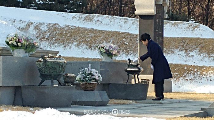 박근혜 대통령이 설을 앞두고 23일 서울 동작구 국립서울현충원을 찾아 박정희 전 대통령과 육영수 여사의 묘소에 성묘를 하고 있다. 박 대통령의 청와대 밖 외출은 지난달 9일 국회의 탄핵 결정 이후 이번이 처음이다. 2017.01.23. (사진=청와대 제공)