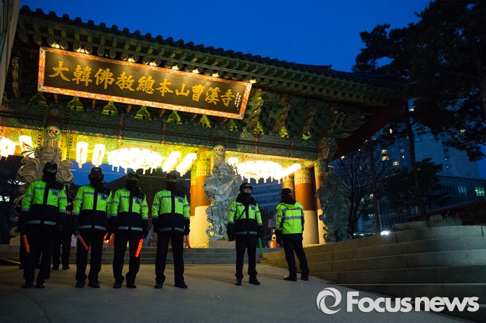 (서울=포커스뉴스) 9일 오전 한상균 민주노총 위원장이 은거하고 있는 서울 종로구 조계사 인근에서 경찰 병력들이 배치돼 경비를 서고 있다.
