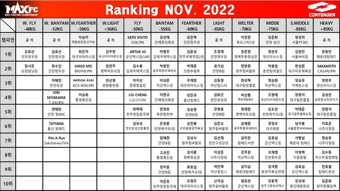 [부자동네타임즈 김인수기자] 국내 최대 입식격투기 단체 MAX FC(대표 이용복)가 2022년 11월 종합 랭킹을 발표했다.