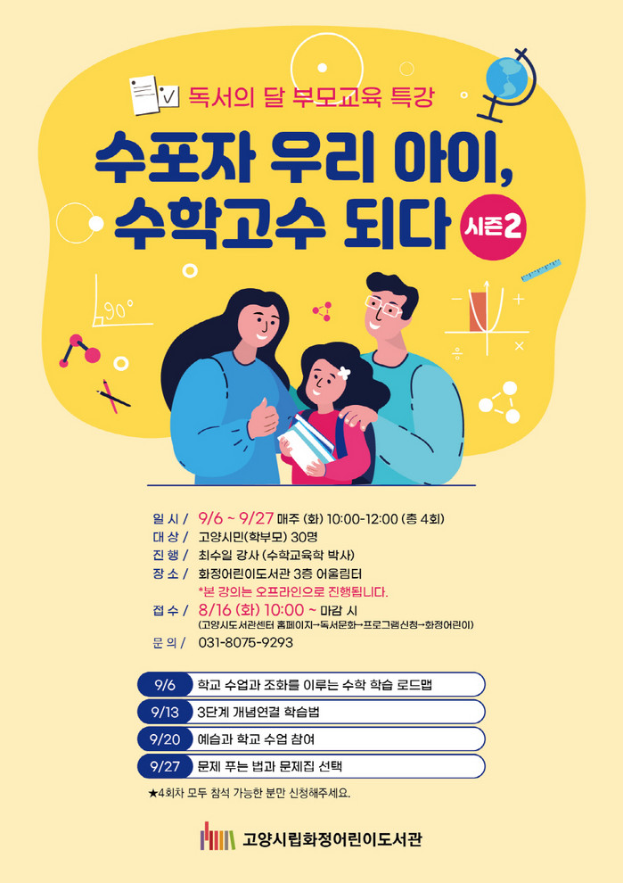 [부자동네타임즈 김인수기자] 고양특례시(시장 이동환) 화정어린이도서관이 독서의 달을 맞이하여 부모교육 특강인 「수포자 우리 아이, 수학고수 되다! 시즌2」를 운영한다.