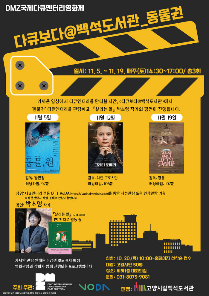 다큐보다@백석도서관_동물권은 DMZ국제다큐멘터리영화제가 주최, 주관하고 백석도서관과 협력해 진행된다. 강의는 현재 기자로 활동 중이며 2020년에 동물권 에세이 살리는 일을 펴낸 동물 활동가 박소영 작가가 진행할 예정이다.