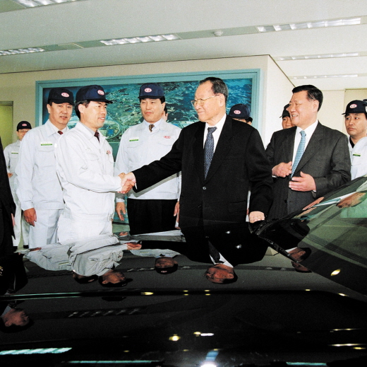 △ 1999년 기아자동차를 인수한 후 화성공장을 방문한 아산. 기아자동차 인수는 한국 자동차 산업의 고도 화를 위한 또 다른 도전이었다. <사진제공=현대기아자동차> |