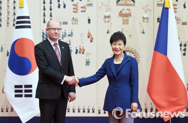 △ 박근혜 대통령이 1박2일간의 프랑스 파리 일정을 마치고 1일 오후(현지시간) 두 번째 순방지인 체코 프라하에 도착했다. 사진은 지난 2월 26일 오전 청와대에서 만난 박근혜 대통령과 보후슬라프 소보트카 체코 총리 모습. <사진출처=청와대> |