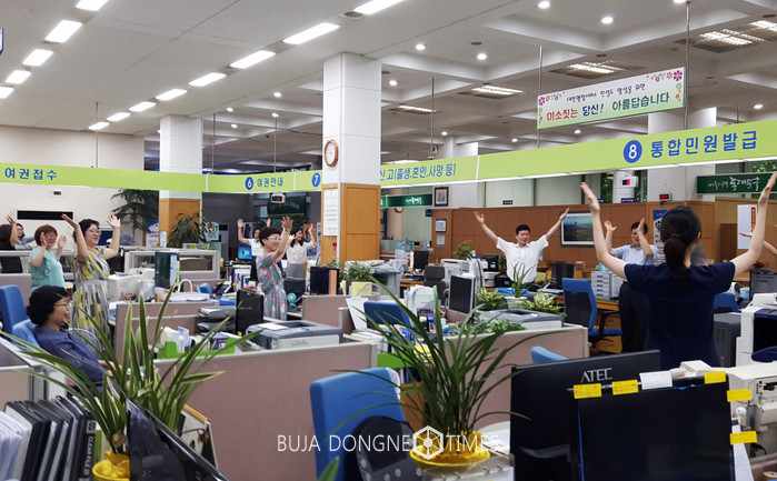 [부자동네타임즈 이병도 기자]동대문구청 종합민원실에서는 매일 아침 ‘미소 짓는 당신이 아름답습니다!’는 구호가 울려 퍼진다. 민원인을 친절하게 맞이하기 위한 직원들의 외침이 어느덧 구민들에게도 익숙한 모습으로 비춰지고 있다.