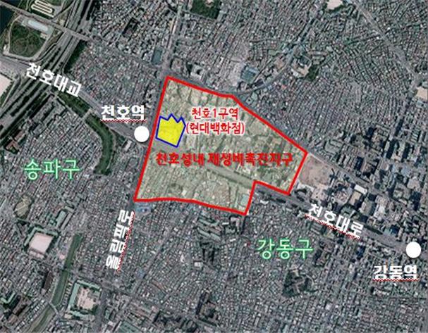 천호1촉진구역은 도시환경 개선 및 상업‧업무기능의 촉진을 통한 지역경제 활성화를 위해 지난 2008년 지정된 천호‧성내재정비촉진지구 내 정비구역 중 하나로, 당초 지하7층~지상14층, 연면적 7만4천㎡의 천호현대백화점이 위치한 지역이다. 이번 도시환경정비사업으로 기존 건물에 연면적 약 2만5천㎡ 규모의 지하5층~지상7층 수평 증축공사가 완료됐다.