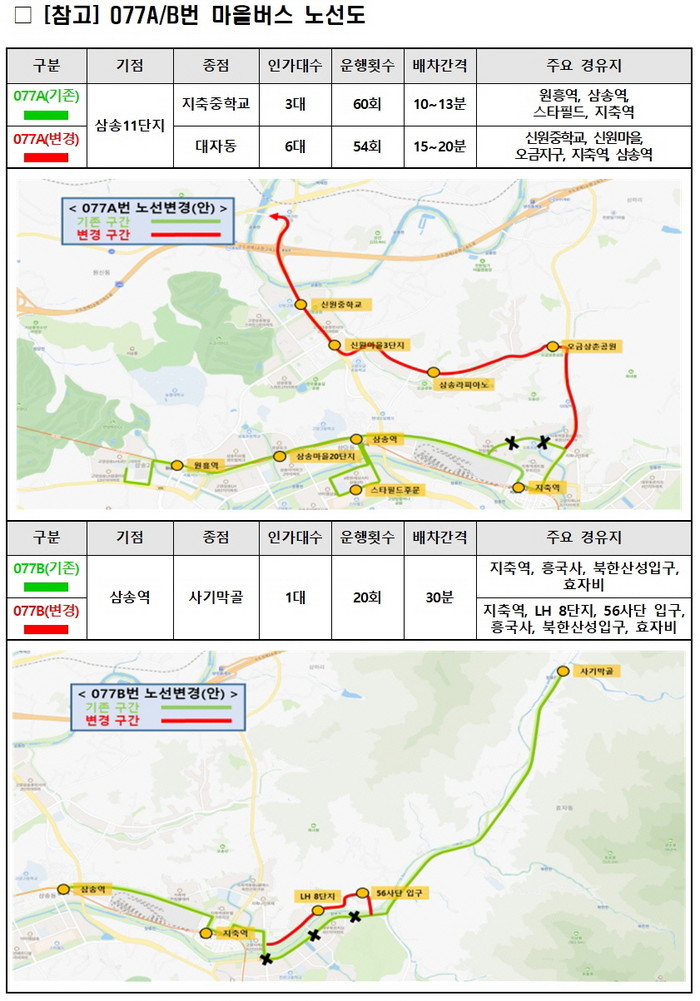 한편, 077A번 마을버스 증차로 093번과 076번 마을버스 운행이 중단되는 신원마을 9·10단지 주민들을 위해 033번 마을버스를 제공하여 주민 불편을 최소화할 계획이다.