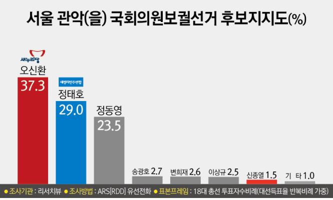 ▲ 관악(을) “오신환(37.3%) vs 정태호(29.0%)”, 오신환 오차범위내 8.3%p 앞서