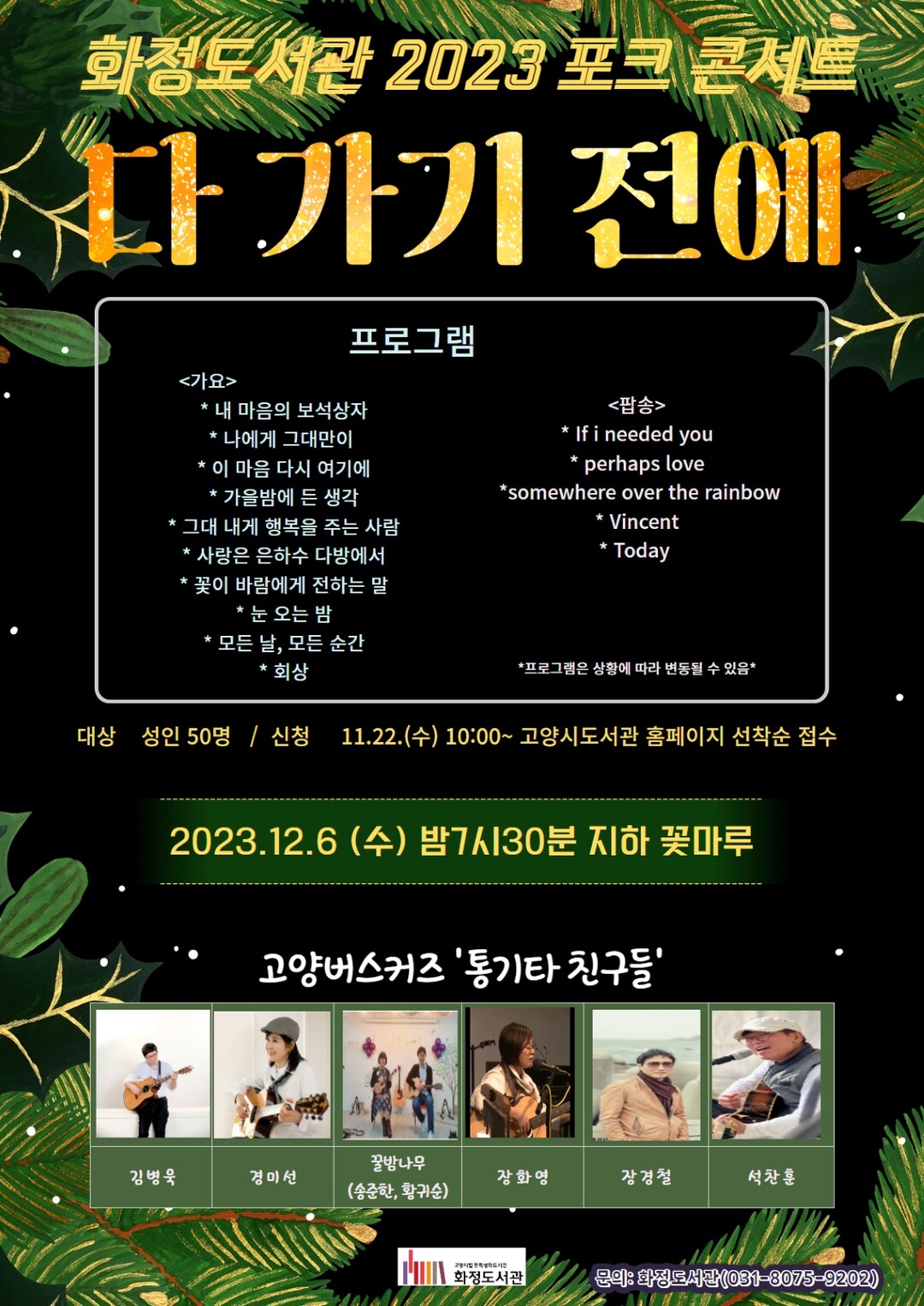 [부자동네타임즈 = 김인수 기자] 화정도서관이 12월 6일 도서관 지하 꽃마루에서 2023년 한 해를 마무리하는 송년 포크 콘서트 ‘다 가기 전에’를 연다. 이날 ‘통기타 친구들’이 감미로운 공연을 펼칠 예정이다.