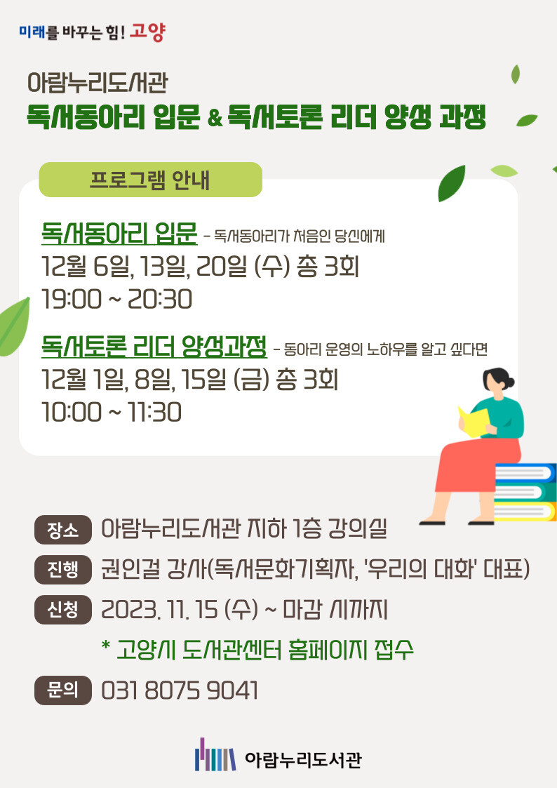 [부자동네타임즈 = 김인수 기자] 아람누리도서관이 12월 1일(금)부터 12월 20일(수)까지 성인을 대상으로 ‘독서동아리 입문 과정’과 ‘독서토론 리더 양성 과정’을 운영한다.