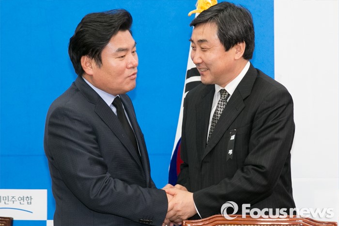 | △ 한·중 자유무역협정(FTA)이 30일 국회에서 통과될 전망이다. 새누리당 원유철 원내대표와 조원진 원내수석부대표, 새정치민주연합 이종걸 원내대표와 이춘석 원내수석부대표는 29일~30일 마라톤협상 끝에 잠정합의안 도출에 성공했다. 사진은 24일 누리과정예산 논의를 위한 여야 원내지도부 간담회에서 인사를 나누는 원유철(왼쪽), 이종걸 여야 원내대표. <사진제공=포커스뉴스> |