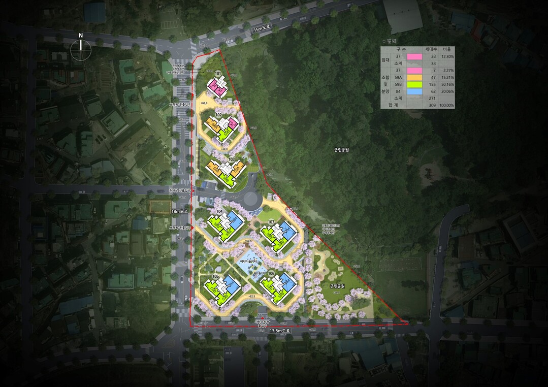 건축물의 경우, 지상 17층 7개 동 총 309세대(임대 38세대, 분양 271세대) 공동주택, 부대복리시설 및 근린생활시설이 설치될 예정이다. 주변 경관과의 조화를 고려한 색채와 개방감 있는 단지 배치 및 리듬감 있는 하늘선(스카이라인)으로 주목 받고 있다.