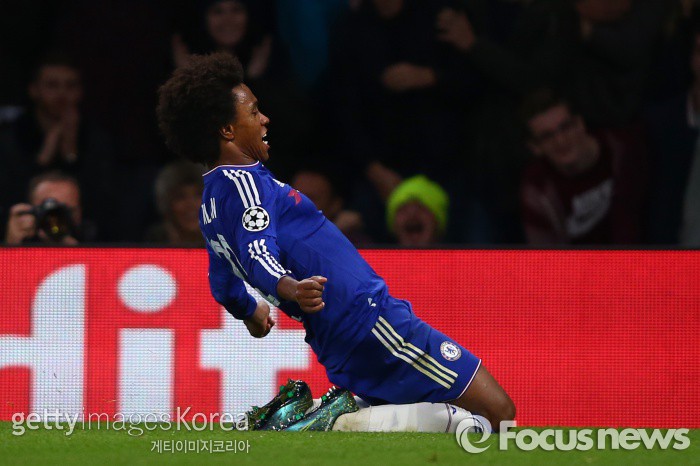 | △ <런던/영국=게티/포커스뉴스> 첼시 소속 윌리안이 11월5일 새벽(한국시간) 홈에서 열린 디나모 키예프와의 경기에서 후반 역전골을 기록한 뒤 환호하고 있다. (C)게티이미지/멀티비츠 |
