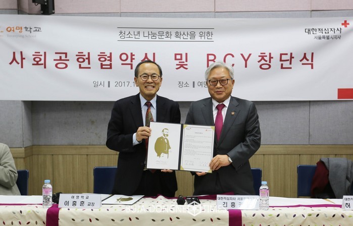 [부자동네타임즈 이병도 기자]12월 4일(월), 대한적십자사 서울특별시지사(회장 김흥권)와 여명학교(교장 이흥훈)가 청소년 봉사정신 함양을 위한 사회공헌협약을 체결했다.