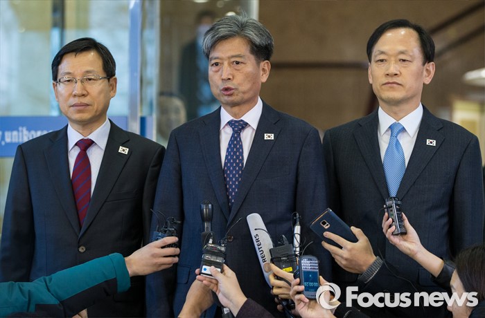 | △ 11일 오전 서울 종로구 남북회담본부에서 황부기(가운데) 통일부 차관이 남북당국회담을 출발하기 전 취재진의 질문에 답하고 있다. |