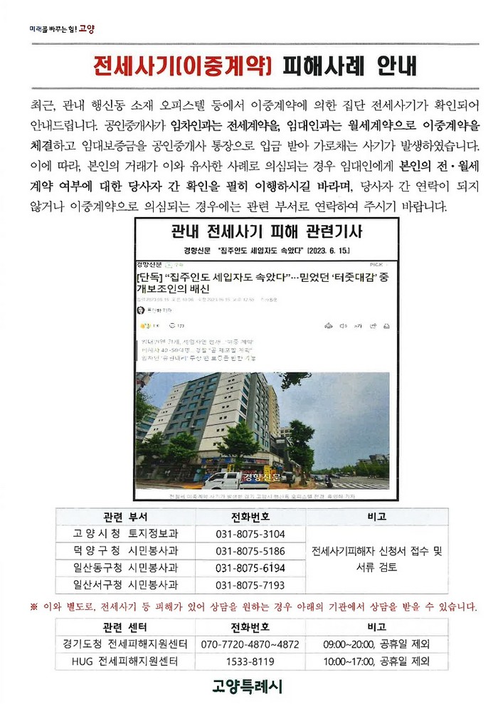 [부자동네타임즈 김인수기자] 최근 관내 행신동 소재 오피스텔에서 발생한 이중계약에 따른 집단 전세사기와 관련하여 전세사기 예방을 위한 신고 창구를 개설했다고 지난 16일 밝혔다.