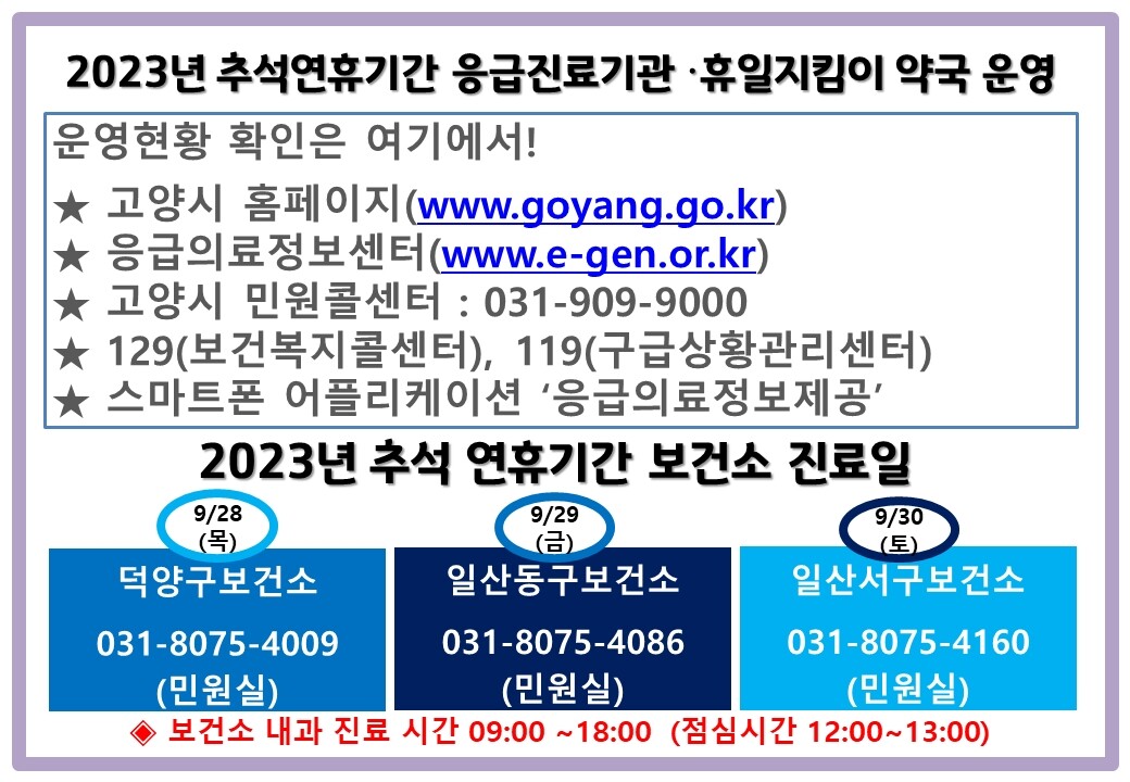명절 기간 운영하는 의료기관 및 약국 현황은 응급의료정보센터 또는 고양시 홈페이지에서 확인할 수 있으며, 고양시 민원콜센터(031-909-9000)를 통해서도 확인할 수 있다.