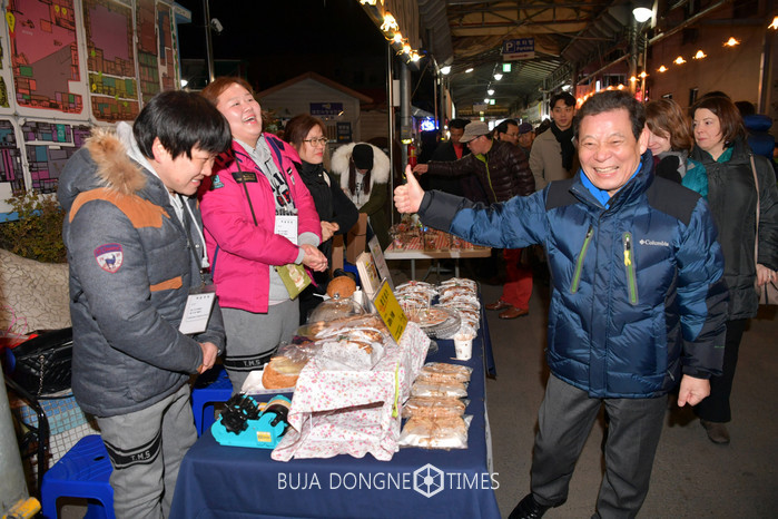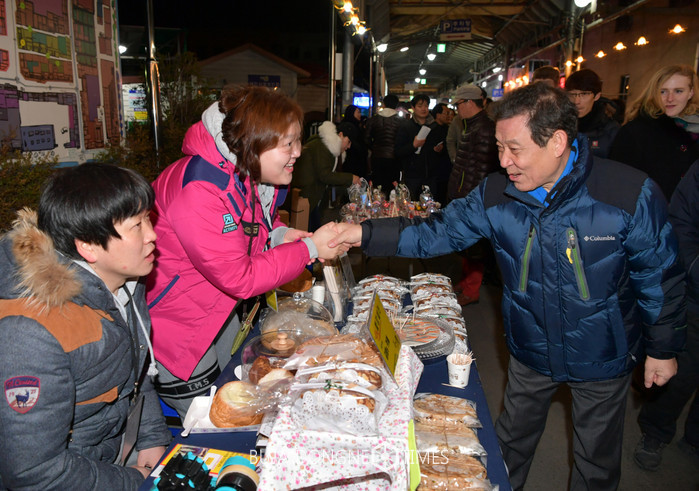 | △윤장현 광주광역시장이 18일 저녁 올해 첫 개장한 대인예술야시장을 찾아 상가를 둘러보고 상인들을 격려하고 있다 |