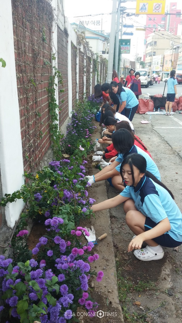 | △전남여고 학생회와 마을공동체는 학교 후문 담 아래 잡초와 쓰레기를 깨끗이 치우고 예쁜 꽃을 심는 활동을 펼쳤다 |