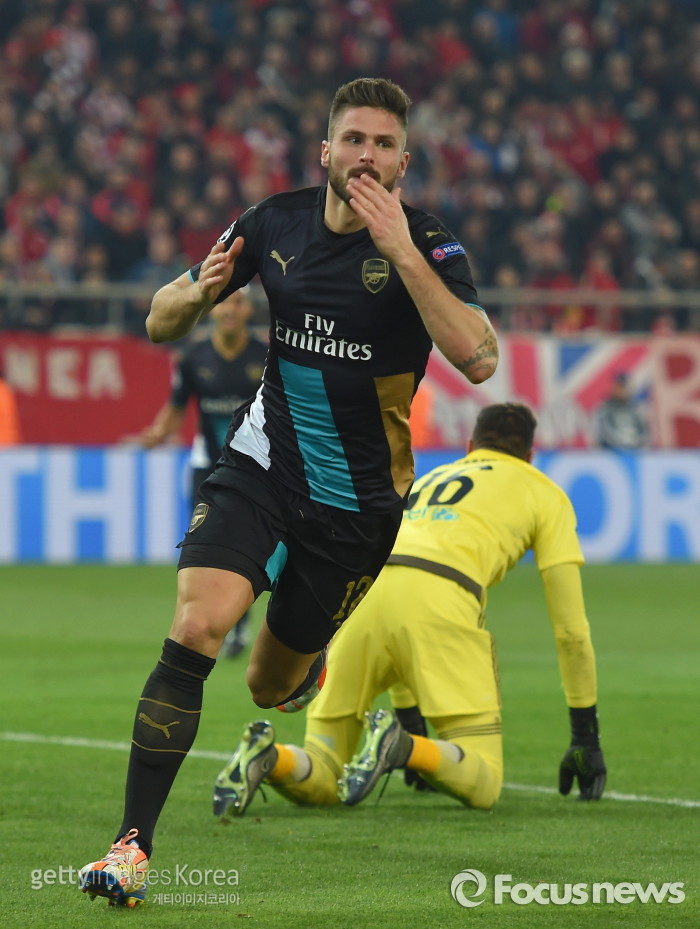| △ <피래우스/그리스=게티/포커스뉴스> 아스날 공격수 올리비에 지루가 12월10일 새벽(한국시간) 올림피아코스와의 챔피언스리그 조별라운드 6차전 원정경기에서 득점을 올린 뒤 환호하고 있다. (C)게티이미지/멀티비츠 |