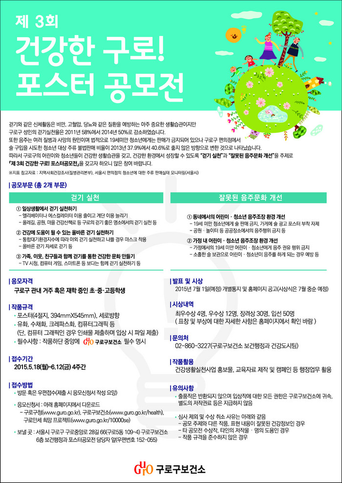 참여를 원하는 이는 응모신청서를 작성해 작품과 함께 구로구보건소로 방문하거나 우편으로 접수하면 된다.