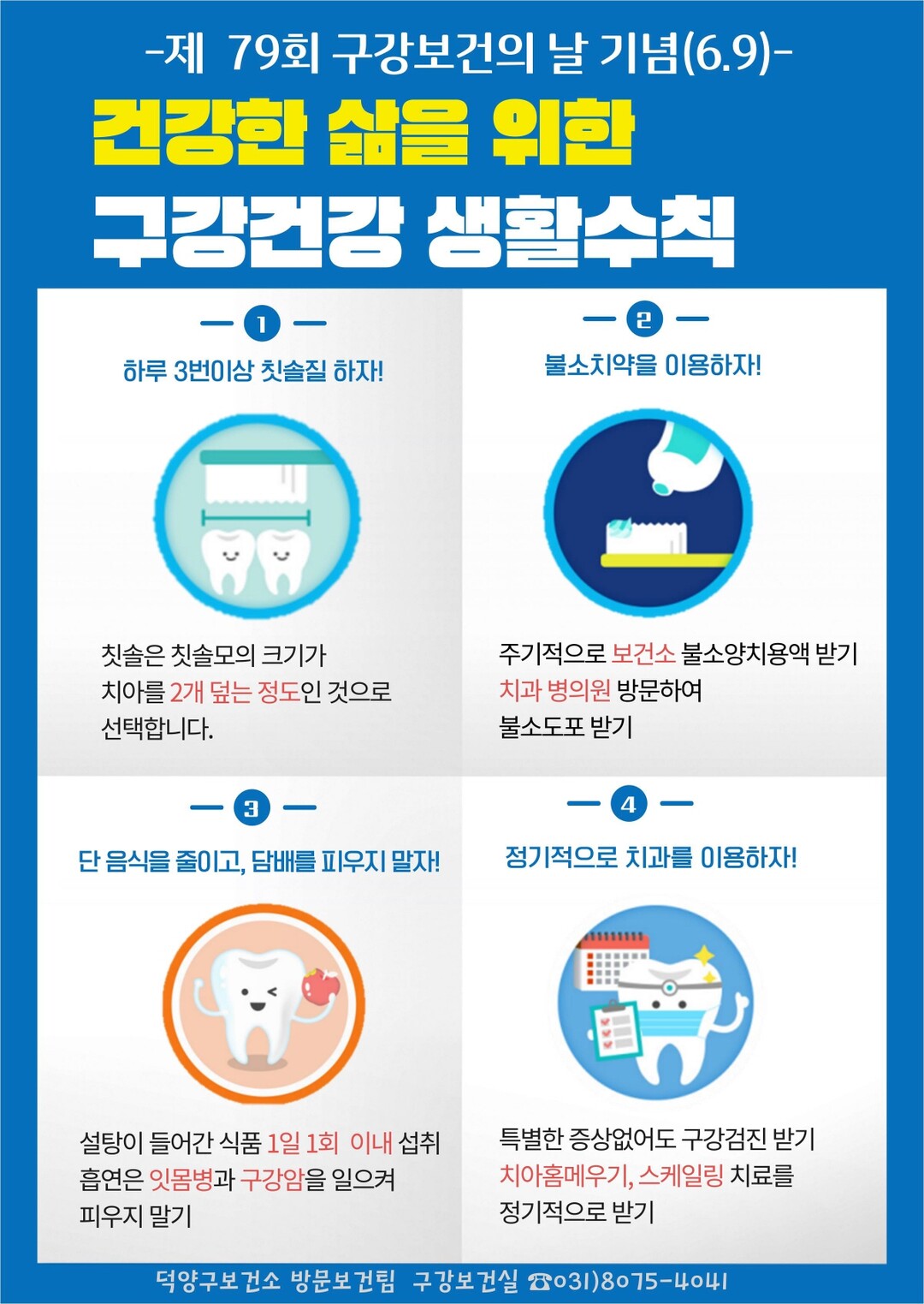 [부자동네타임즈 = 김인수 기자] 고양특례시 덕양구보건소는 구강보건의 날 기념주간(2024. 6. 4.~6. 10.)을 맞이해 지역주민 대상으로‘2024년도 제79회 구강보건의 날 행사’를 오는 6월 3일부터 13일까지 진행한다고 밝혔다.