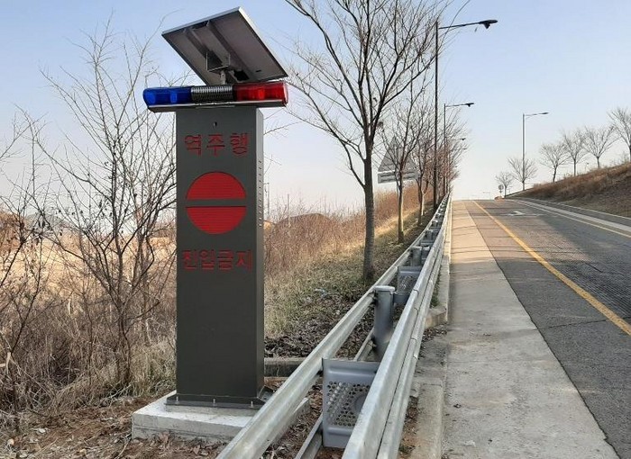 역주행 방지 시설물은 역주행 차량이 발생하면 자동감지센서를 통해 강한LED 불빛과 경고음을 발생시켜 역주행 차량 운전자에게 시각적·청각적으로 메시지를 전달하는 효과를 낸다.
